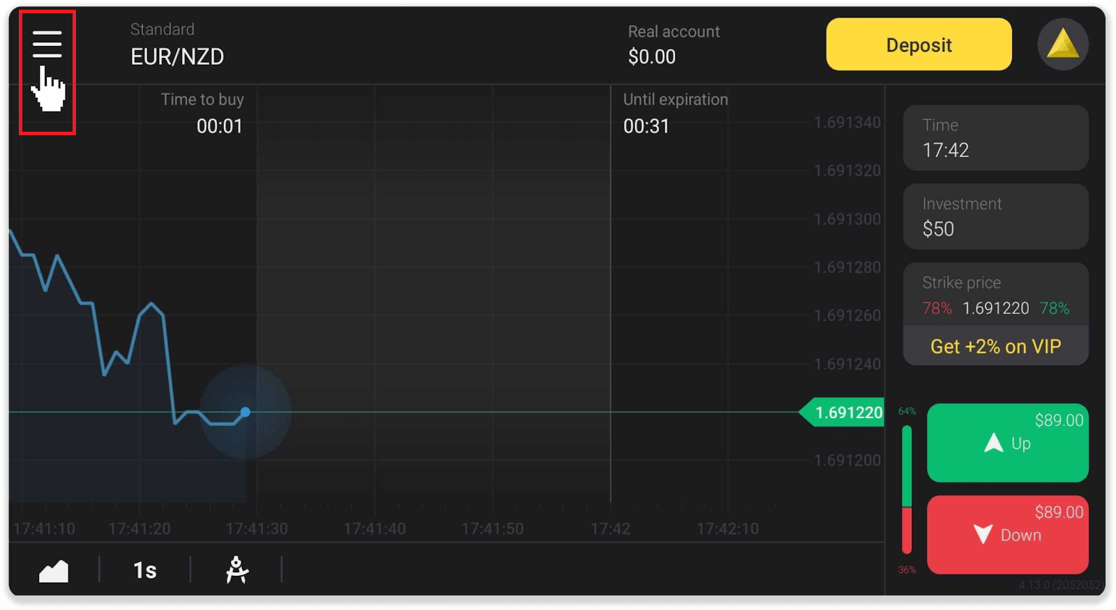 অবশিষ্ট সময় (মোবাইল অ্যাপ ব্যবহারকারীদের জন্য কেনার সময়) দেখায় যে নির্বাচিত মেয়াদ শেষ হওয়ার সময় সহ একটি ট্রেড খোলার জন্য কত সময় বাকি আছে। আপনি চার্টের উপরে অবশিষ্ট সময় দেখতে পারেন (প্ল্যাটফর্মের ওয়েব সংস্করণে), এবং এটি চার্টে একটি লাল উল্লম্ব লাইন দ্বারাও নির্দেশিত।
