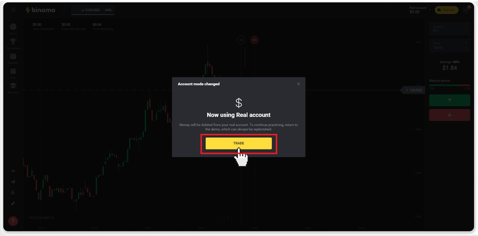 3. প্ল্যাটফর্ম আপনাকে অবহিত করবে যে আপনি এখন আসল তহবিল ব্যবহার করছেন ৷ " বাণিজ্য " ক্লিক করুন।