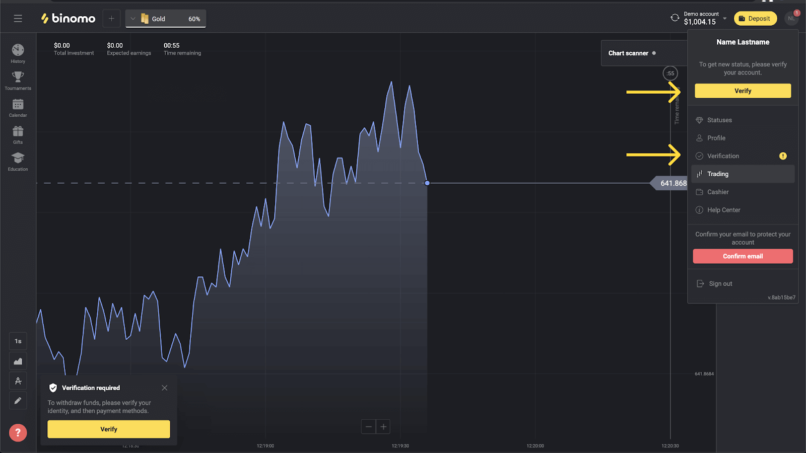 3. এর পরে আপনার দেওয়া ইমেল ঠিকানায় একটি নিশ্চিতকরণ ইমেল পাঠানো হবে। আপনার অ্যাকাউন্ট সুরক্ষিত করতে আপনার ইমেল ঠিকানা নিশ্চিত করুন এবং আরও প্ল্যাটফর্মের ক্ষমতা আনলক করুন, "ইমেল নিশ্চিত করুন" বোতামে ক্লিক করুন 4. আপনার ইমেল সফলভাবে নিশ্চিত করা হয়েছে. আপনাকে স্বয়ংক্রিয়ভাবে বিনোমো ট্রেডিং প্ল্যাটফর্মে পুনঃনির্দেশিত করা হবে। এখন আপনি একজন বিনোমো ট্রেডার, আপনার ডেমো অ্যাকাউন্টে $10,000 আছে এবং আপনি জমা করার পর একটি বাস্তব বা টুর্নামেন্ট অ্যাকাউন্টেও ট্রেড করতে পারেন। বিনোমোতে কীভাবে জমা করবেন